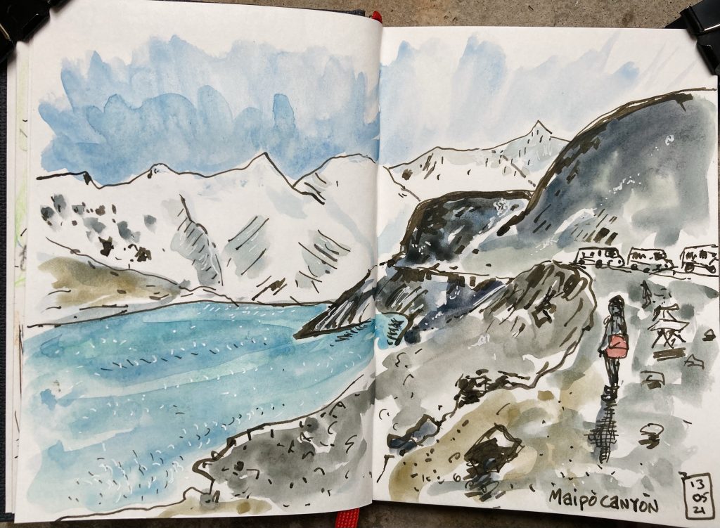 First stop in May, was Santiago, Chile! I started using Google street view for this scene, which although is still sketching from a photograph, I feel a bit more control in choosing the composition and view point at least! it also gives a feel of actually visiting the place as you can have a proper 360° look around, and pick and choose from lots of user uploaded location pictures.